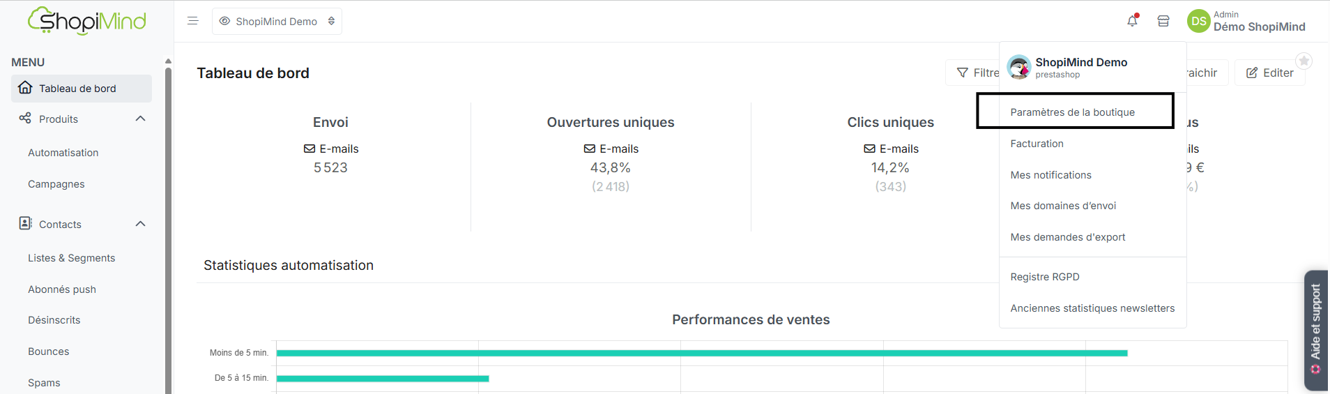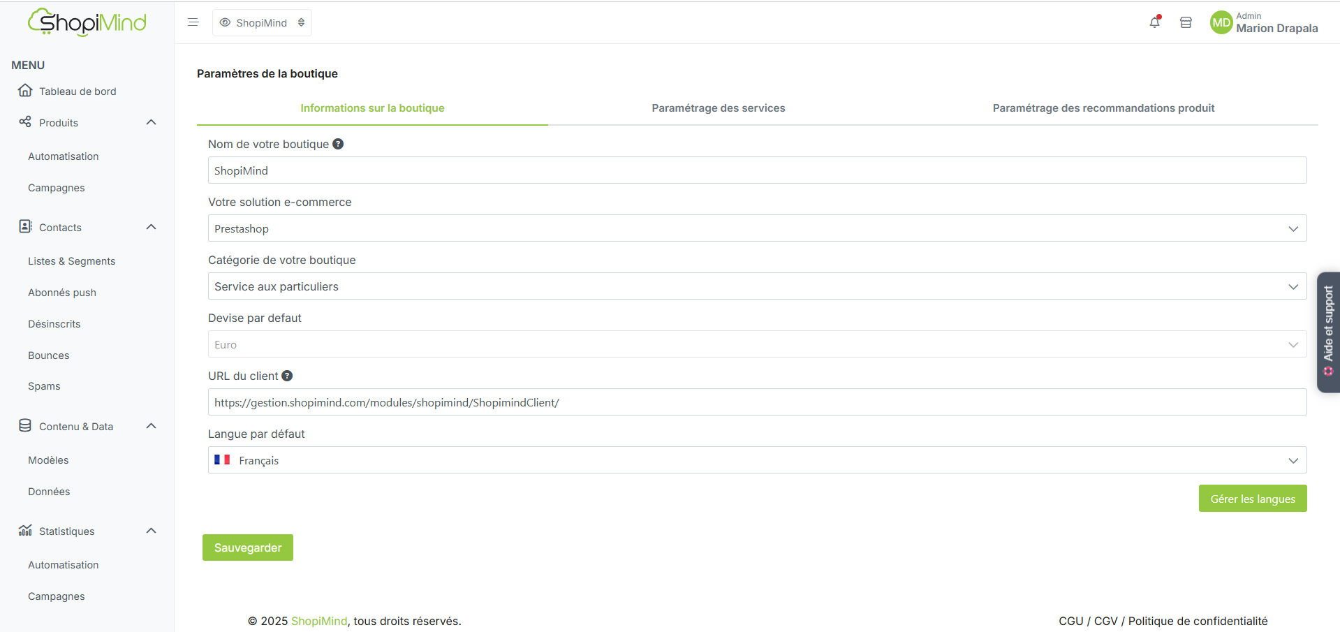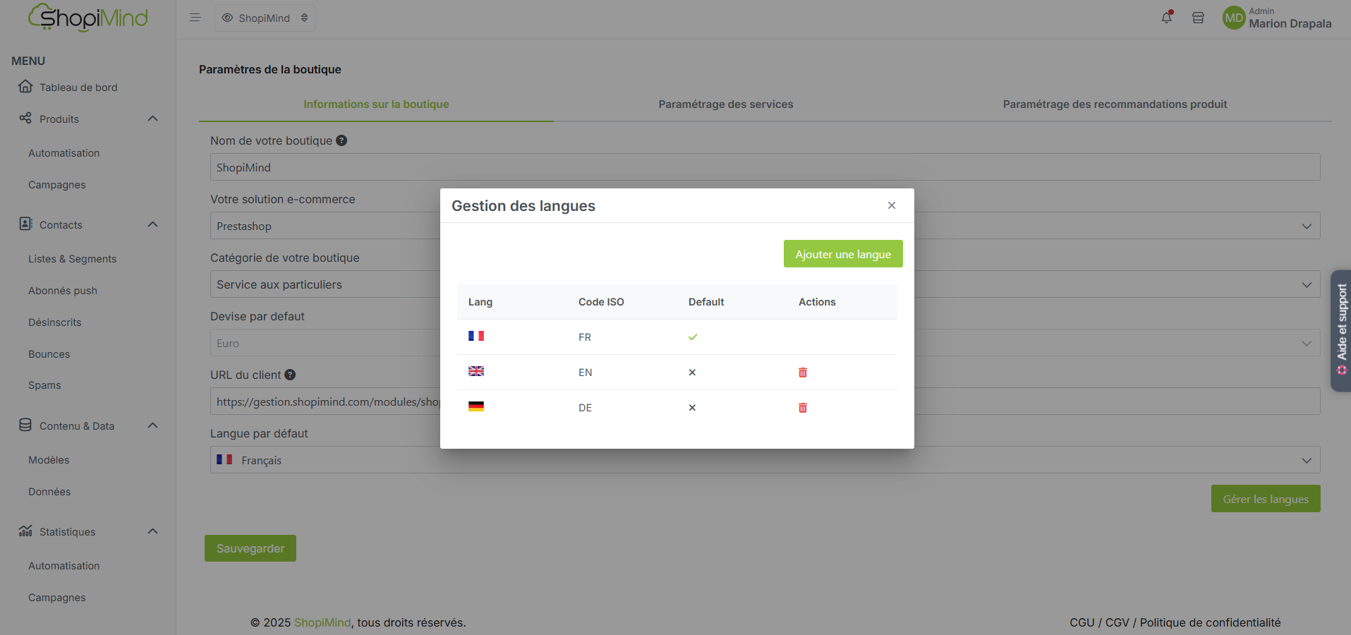 To add, remove, or change a language detected by ShopiMind, go to your store settings: